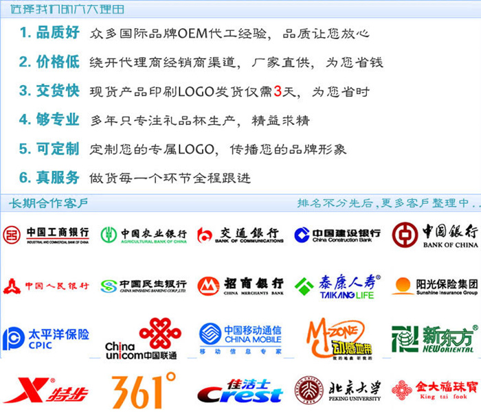 本工廠注重打造產(chǎn)品的品質(zhì),服務(wù),客戶的精準(zhǔn)貨期,讓客戶下單之后無后顧之憂。銷售網(wǎng)絡(luò)已經(jīng)遍布全國(guó),在全國(guó)部分城市設(shè)立有辦事處,歡迎空白區(qū)域的禮品商,商超、禮品公司,廣告公司,批發(fā)渠道商合作,共同打造集團(tuán)化的優(yōu)勢(shì),共創(chuàng)美好未來。